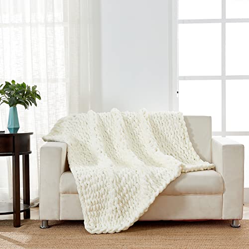 Longhui bedding Handmade Chunky Knit Blankets, Luxurious Chenille Cable Knit Throw Blanket Yarn for Couch Sofa and Bed, Ultra Soft Decorative Cream Christmas Blanket, Machine Washable 51 x 63